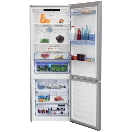 Despre Beko RCNE560E30DZXB va pot spune ca este o combina frigorifica. Fiind combina frigorifica, aveti si congelator, dar si frigider in acelasi aparat. Beko RCNE560E30DZXB separa frigiderul si congelatorul in doua zone de temperatura, fiind izolate una de alta, si avand usi separate, tocmai pentru ca este indezirabil ca temperaturile dintr-o zona sa ajunga in cealalta zona. Imaginati-va cum ar fi daca ce puneti in frigider s-ar congela, iar ce puneti la congelator doar s-ar refrigera, n-ar fi bine sa aveti apa inghetata cand o doreati doar rece, sau ouale, branza, legumele inghetate bocna sa nu le mai puteti manca. Dar inginerii care au creat Beko RCNE560E30DZXB s-au gandit la asta, si au separat zonele de temperatura, si astfel au creat aceasta combina frigorifica, ce are si frigider dar si congelator.