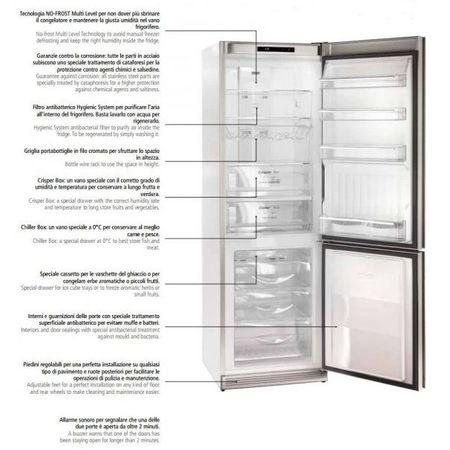Sa va spun, Bompani BOK32NF/B are incorporata tehnologia NoFrost pe nivel multiplu, astfel nu mai trebuie sa dezghetati manual congelatorul, iar in frigider se mentine umiditatea optima, nu se inunda. Bompani BOK32NF/B este garantat sa tina la rugina, toate piesele din inox ale Bompani BOK32NF/B sunt tratate special pentru a fi foarte rezistente la sare, apa si rugina. Bompani BOK32NF/B mai are si un filtru antibacterian care purifica aerul din interior, iar acest filtru se poate spala cand se murdareste. Lazile de jos sunt in felul urmator: o lada speciala, ce mentine umiditatea si temperatura corecta pentru a pastra mult mai bine fructele si legumele, si inca o lada, sub ea, pentru a tine pestele si carnea la fix 0 grade celsius, sa tina mai mult prospetimea. Si congelatorul Bompani BOK32NF/B este interesant, are un lacas special, sus, pentru a congela diverse ierburi sau pentru tavi de gheata, iar usa congelatorului este tratata cu un agent antibacterian ce o tine protejata impotriva bacteriilor. Iar pentru a conserva energie, este echipat si cu o alarma ce suna cand usa este deschisa mai mult de 2 minute.