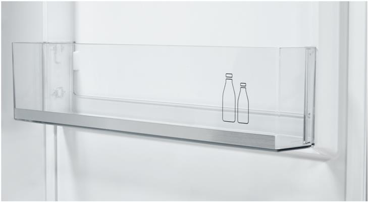 Interiorul este organizat foarte eficient si dispune de un spatiu decent de 297 litri volum net total, dintre care 225 litri volum frigider si 72 litri pentru compartimentul congelator. Interiorul este foarte frumos organizat si regasim 3 rafturi din sticla si 3 suporturi pe usa. Pe usa gasim si un suport pentru oua si pentru sticle voluminoase. Congelatorul este organizat pe 3 compartimente suprapuse care sunt foarte usor de folosit si de intretinut.