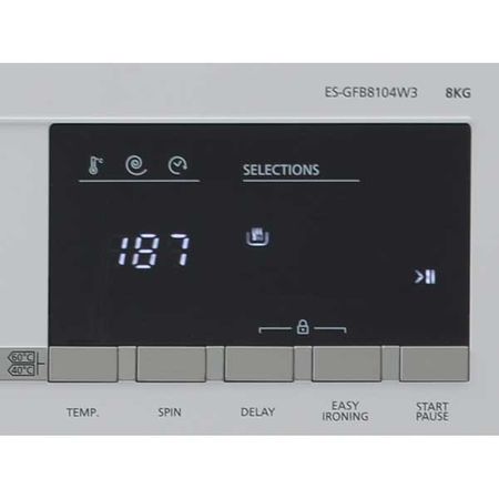 SHARP ES-GFB8104W3E are si un panou de control digital pe fata masinii, iar prin acest panou de control puteti controla temperatura, viteza centrifugii, timpul de intarziere al programului, modul de calcat usor, si pornirea si pauza programului de spalare.