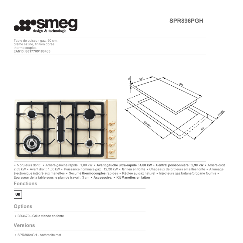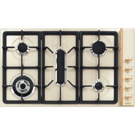 Haideti sa va spun despre Panoul de gaz încorporat Smeg SPR896PGH face parte din seria Coloniale. Grilajele sale masive de fontă, fitingurile din alamă de suprafață și din alamă se potrivesc perfect cu decorarea interioară în stil retro.